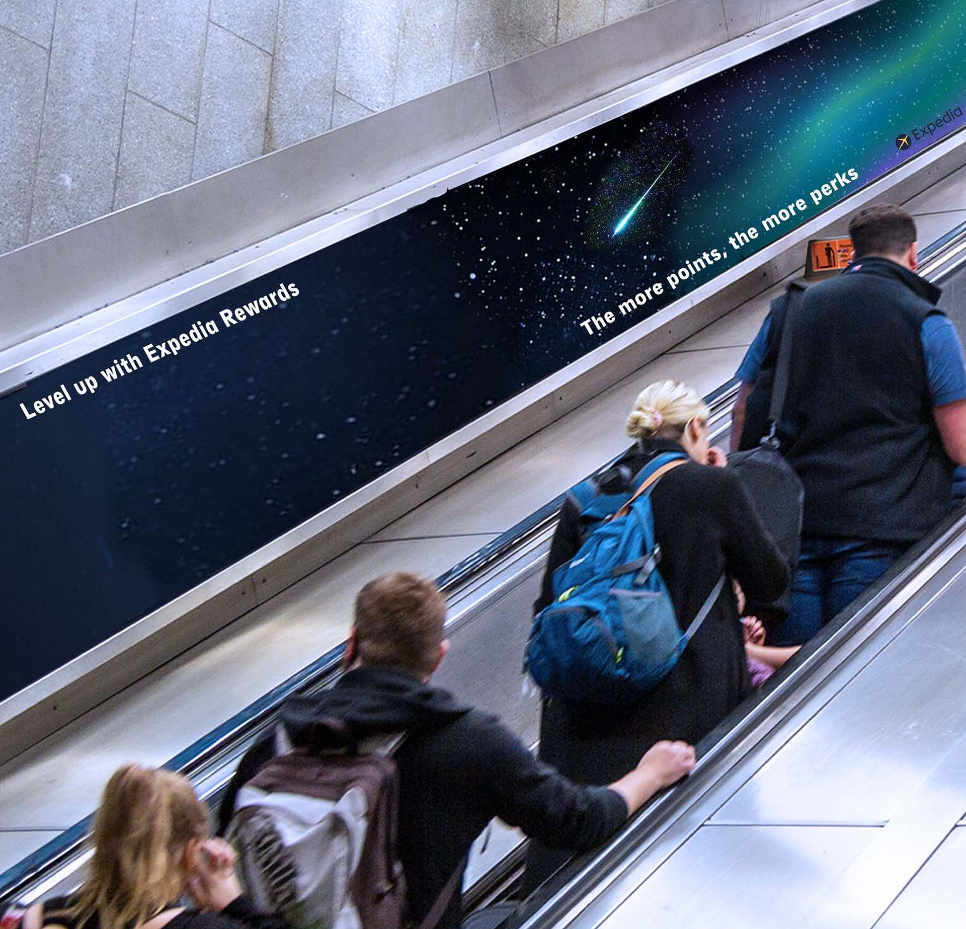 To advertise Expedia Rewards further, we will place print adverts next to escalators, so as the viewers go up, they can see how their experience will improve. In this case, as the escalator goes up, the stars in the sky get better and brighter, until they see the Northern lights.
