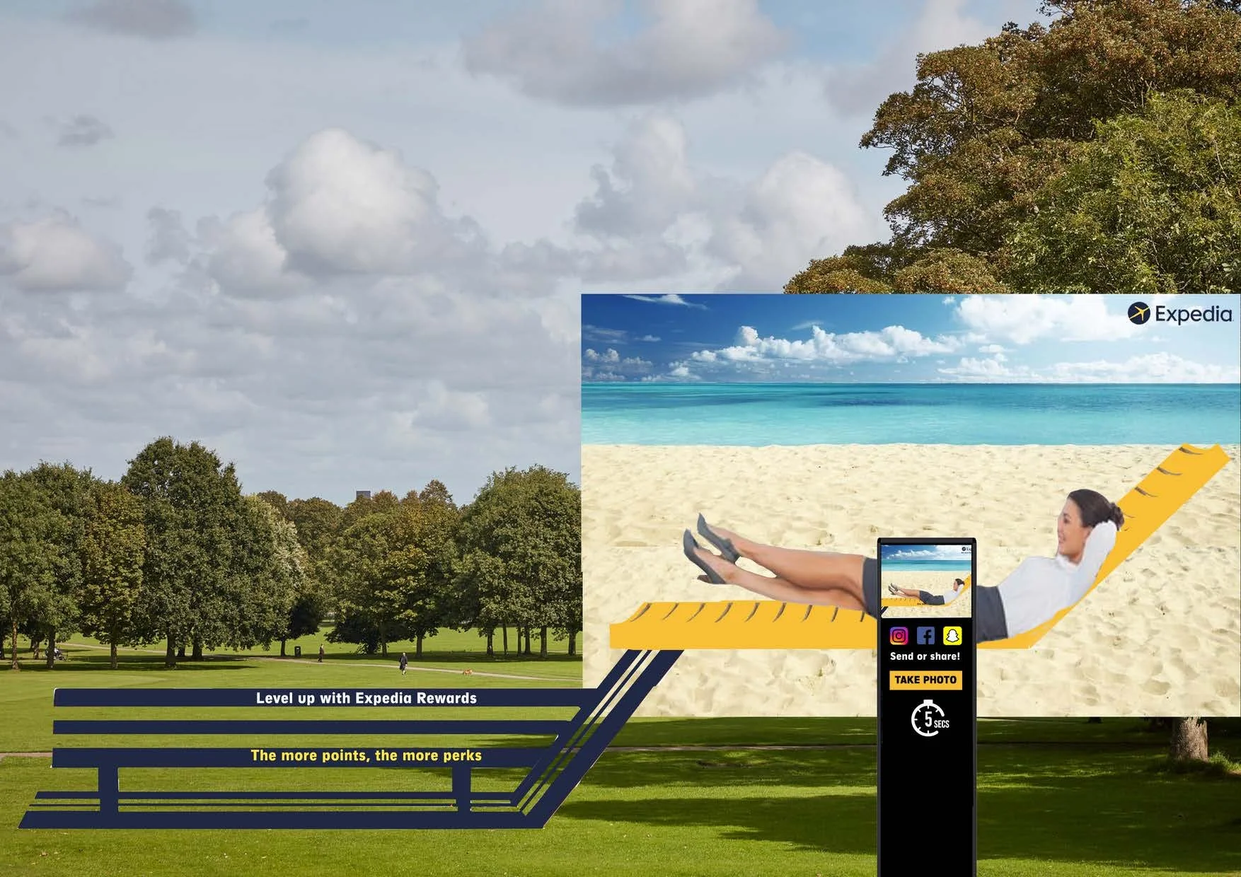 For the special build, we wanted to bring the levelling up to life by playing with perspective, using a 3D billboard. When the viewer first walks towards the advert from the side, they will see a grey pebbly beach, however as they change their perspective, they will be able to see different elements improving the holiday one by one. First, they will see the sky getting bluer, the sand getting less pebbly, cocktails being given, a comfy hammock, a tree for shade, an ice cream, and finally the lines and logo. The Expedia logo places on the floor shows whether the perfect point to see the complete advert is.