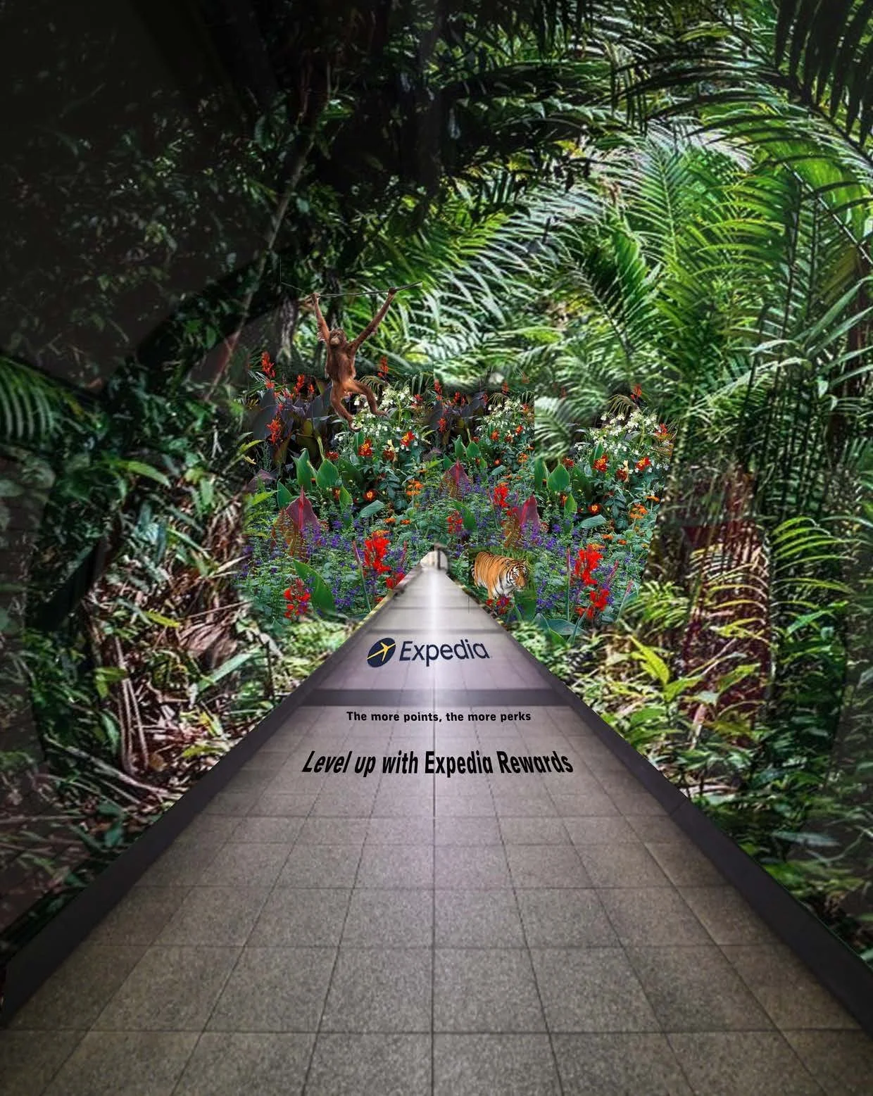 Expedia will also transform walkways in underground stations. As you walk through the tunnel, the forest on the walls gets more exotic and vibrant, with animals featuring at the end. The writing on the floor will explain how you can level up with an Expedia membership.